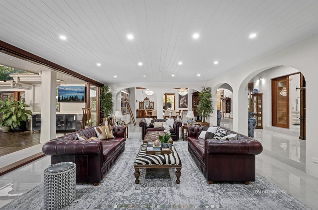 The interiors of the home feature expansive living and dining areas that are sheltered beneath soaring gabled ceilings dotted with crystal chandeliers.