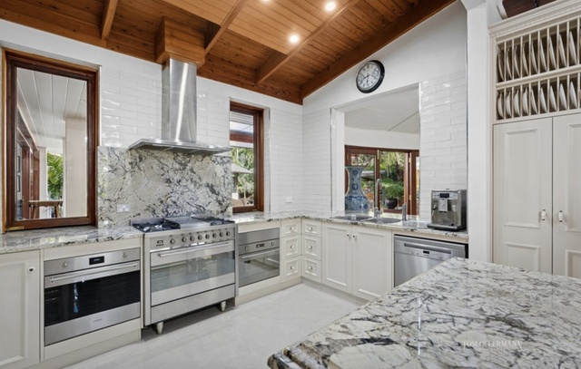 The U-shaped kitchen comes with curved, black-topped birds-eye jarrah on the high and prep benches, also wall cabinetry. A suite of Bosch appliances is augmented by a Samsung icemaker fridge.