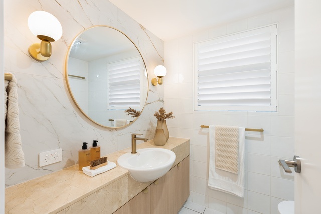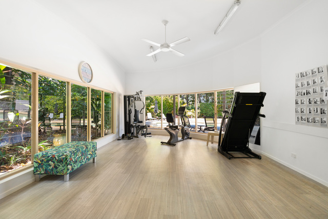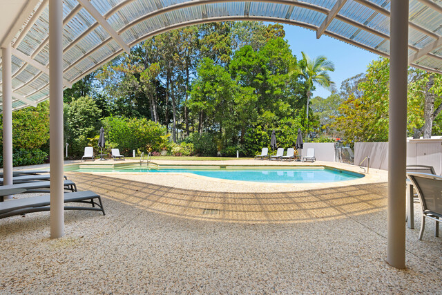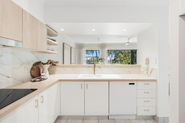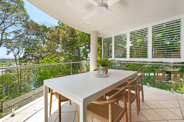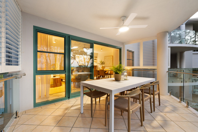 Elevated and light-filled, the apartment enjoys gentle breezes and filtered views through the gums to the Noosa Sound and out across Laguna Bay. The main bedroom serves as a private retreat with a walk-in robe, ensuite and Juliette balcony, ideal for morning coffee or an evening wind-down. Two guest bedrooms, both with built-in robes, open to a shared balcony and are serviced by a family bathroom with a separate bath, shower and powder room.