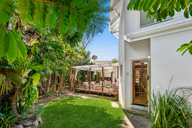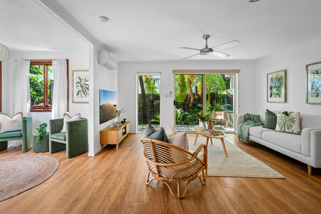 Tucked away at the end of the complex for maximum privacy, the home enjoys a northerly aspect and the peaceful sounds of nature. Inside, modern, light-filled interiors flow from a generous kitchen into relaxed living areas, with timber floors, and cedar-trimmed French doors that open to the tropical garden and alfresco entertaining zone.