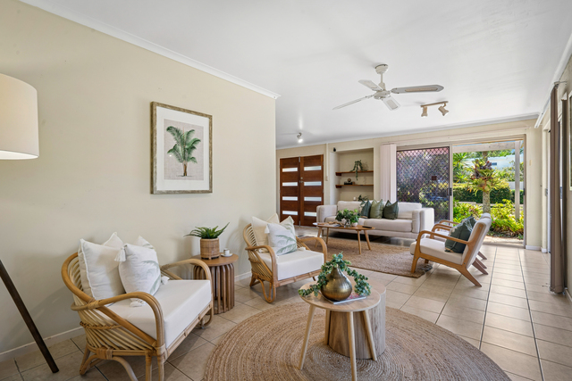 Tucked behind lush sub-tropical gardens brimming with swaying palms and vibrant bougainvillea, this single-level beach house sits proudly on a fantastic, larger than most 793m2 corner block. With its ideal north-facing orientation, the home is bathed in natural light, making every living space feel bright, warm, and welcoming.