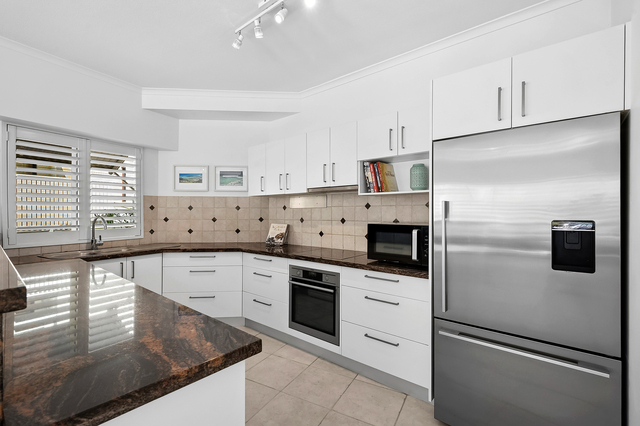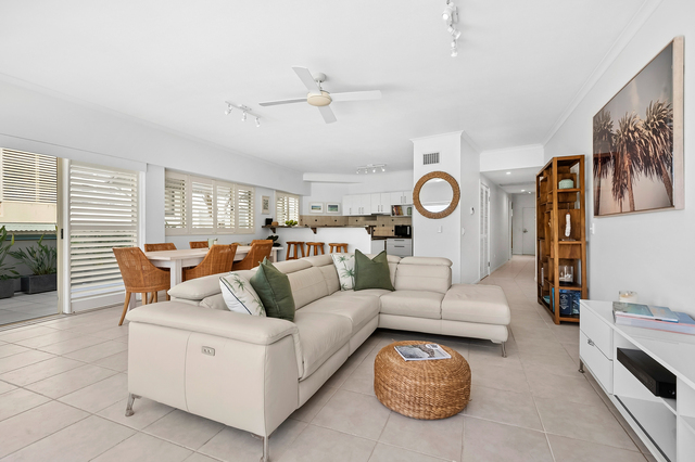 Inside, plantation shutters, ducted reverse-cycle air-conditioning and a light-filled open plan design enhance year-round comfort. The well-appointed kitchen is finished with AEG appliances, a pyrolytic oven, abundant storage and a new dishwasher, making it ideal for the home entertainer. Three bedrooms, all with built-in robes, are serviced by two bathrooms, while a full internal laundry comes complete with Miele washer and dryer. A secure lock-up storeroom in the undercover car park provides additional space for golf clubs, bikes or fishing gear.