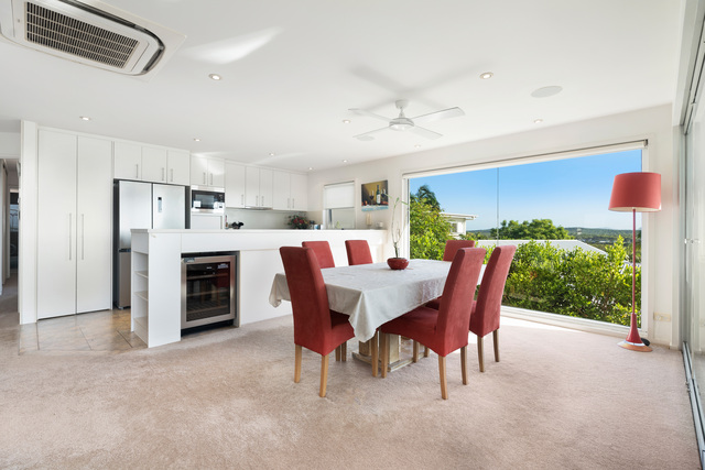 Stacking doors open up to the indoor pool where you can swim in all weather conditions while taking in sensational sunset views over the hinterland. The white kitchen makes entertaining easy and is well-equipped with premium appliances, ample cabinetry, and a wine fridge.