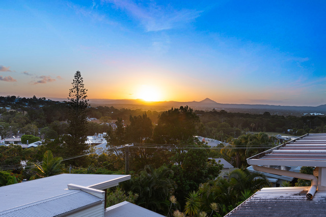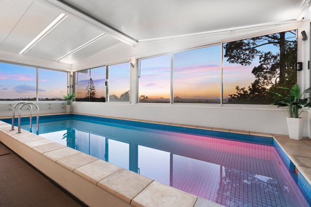 Stacking doors open up to the indoor pool where you can swim in all weather conditions while taking in sensational sunset views over the hinterland. The white kitchen makes entertaining easy and is well-equipped with premium appliances, ample cabinetry, and a wine fridge.