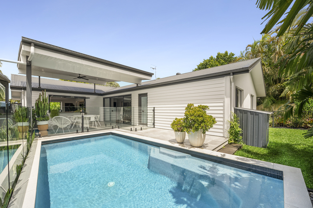 Relax or entertain by the pool set in lush tropical surrounds with automated irrigation. The master suite includes a full wall of built-in robes and a stylish ensuite, while two queen-sized bedrooms are serviced by a stunning main bathroom with freestanding bath and walk-in shower.