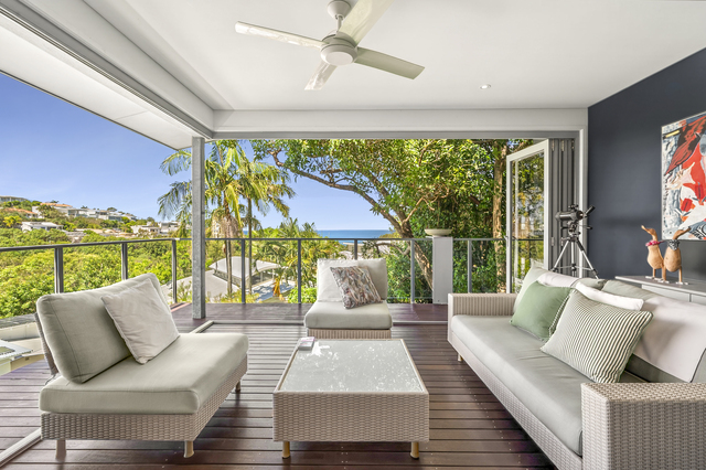 From the living zone, a balcony plus a covered outdoor entertaining area take in sensational views across the treetops to the ocean. Stacking doors enclose the main outdoor deck making it more like an outdoor room which you can open or close depending on the weather. Sit back, unwind, and enjoy cool sea breezes and verdant vistas from this elevated outdoor space.