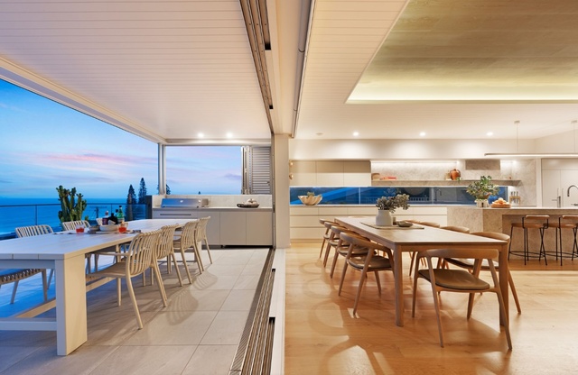 The main living zone occupies the central floor, where stacker doors open to a covered balcony capturing the panoramic ocean outlook.