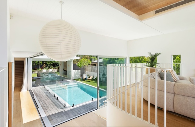 A statement staircase leads to the poolside level, complete with a second living area, home office, bathroom and covered alfresco.