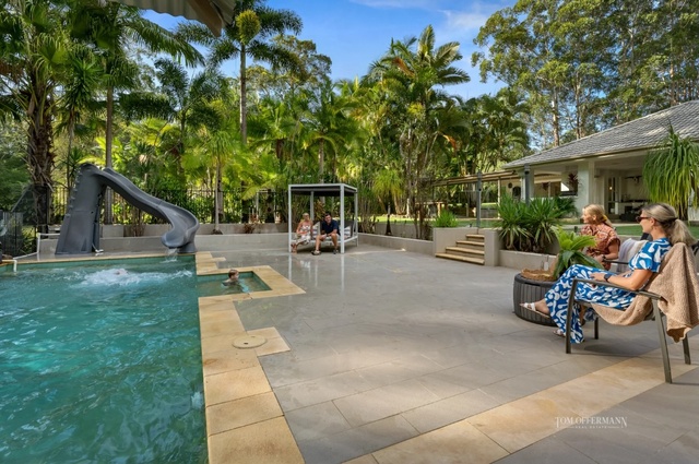 The totally private alfresco entertaining zone comes with a resort-style pool and water feature, powered Balinese-style gazebo, covered terrace, timber decking, dedicated firepit area, and lush forest backdrop.