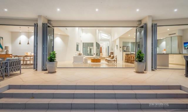 From the wide driveway and entry statement timber pivot door, there is a gallery-like hallway with a tall wall of glass panes that interconnect with the spectacular crystal-clear pool and pavilion with sun terrace.